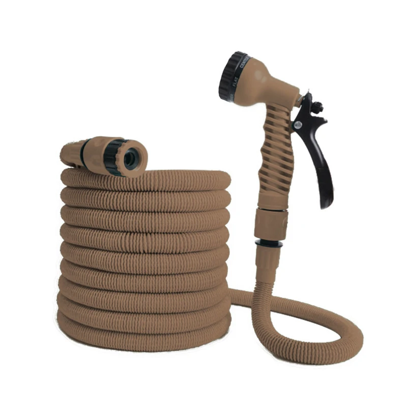 Λάστιχο ποτίσματος επεκτεινόμενο σετ σε καφέ χρώμα της σειράς Terra από την Estia - Διαστάσεις: 5-15m / Το σετ περιλαμβάνει: Πιστόλι νερού με 7 λειτουργίες, 2 ταχυσυνδέσμουςκαι 1 προσαρμογέα βρύσης.