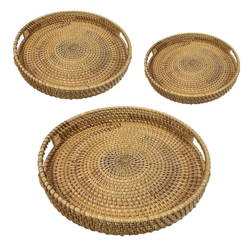Σετ 3τμχ διακοσμητικός δίσκος rattan σε στρογγυλό σχήμα και σε φυσικό χρώμα από την ESPIEL - Διαστάσεις: 35x4εκ.-30x4εκ.-26x4εκ.