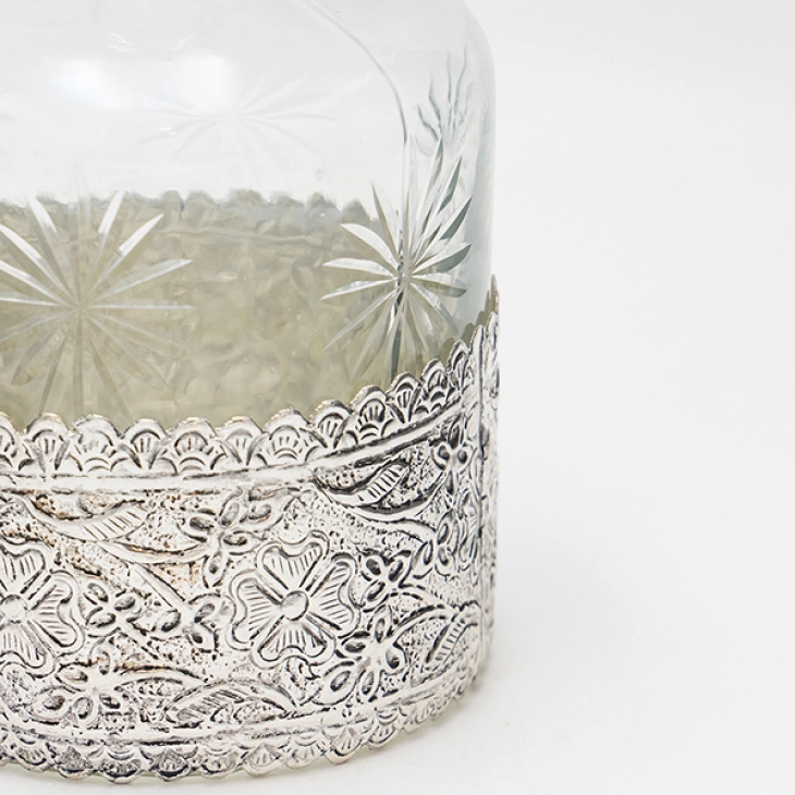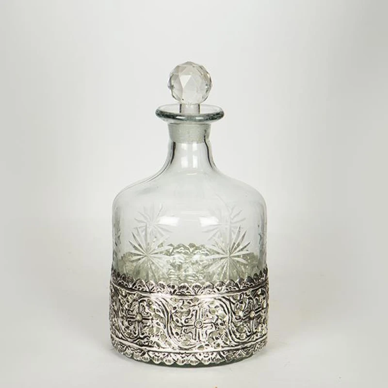 Καράφα γυάλινη διάφανη με μεταλλικό διακοσμητικό στοιχείο σε ασημί χρώμα από την ESTHETI -Διαστάσεις: 13x24εκ.