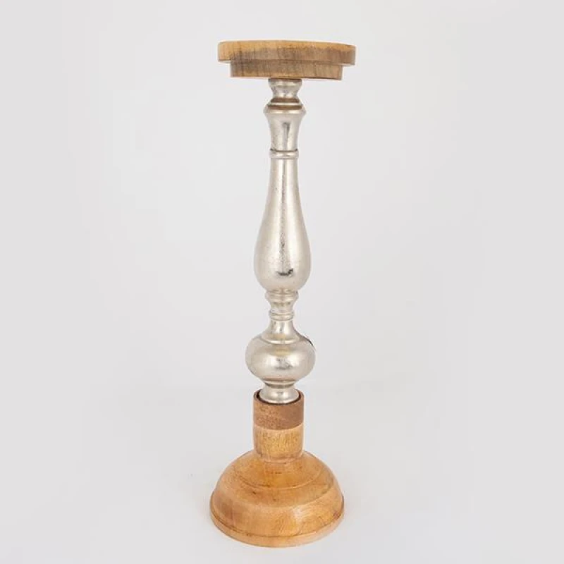 Κηροπήγιο ξύλινο - μεταλλικό σε ασημί - natural χρώμα από την ESTHETI - Διαστάσεις: 15x51εκ.