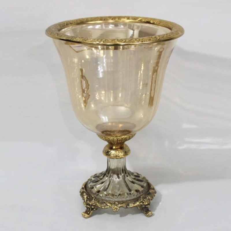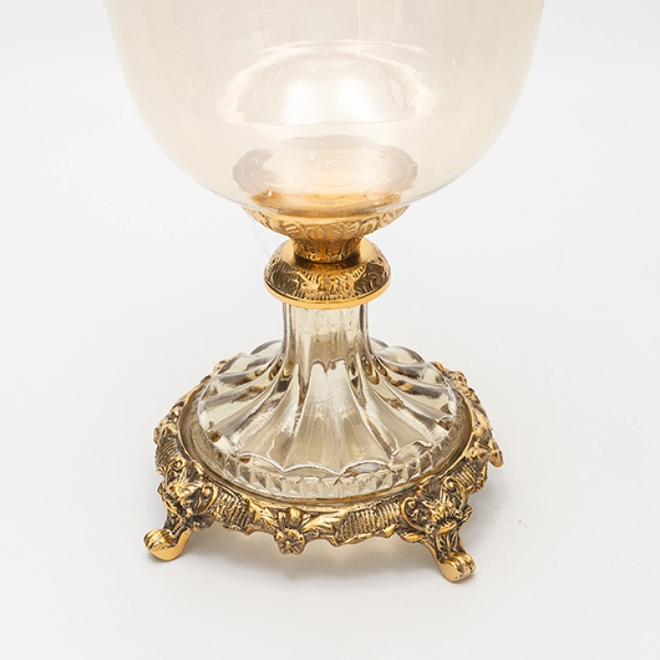 Διακοσμητικό μπωλ με πόδι γυάλινο, σε μελί χρώμα με μεταλλικά αντικέ χρυσά τελειώματα από την ESTHETI - Διαστάσεις: 19x19x27εκ.