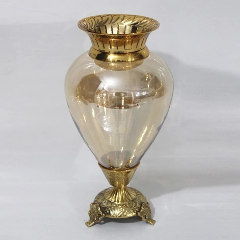 Βάζο γυάλινο μελί με μεταλλικά αντικέ χρυσά τελειώματα από την ESTHETI - Διαστάσεις: 17x33εκ.