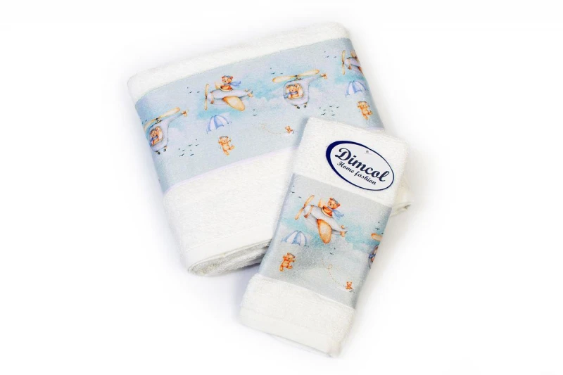 Σετ βρεφικές πετσέτες μπάνιου που περιέχει: 1 τεμάχιο πετσέτα χειρός διαστάσεων 30X50 cm και 1 τεμάχιο πετσέτα μπάνιου διαστάσεων 70X140 cm. Οι πετσέτες έχουν υφασμάτινη φάσα με ψηφιακά τυπωμένα χρωματιστά σχέδια και είναι κατασκευασμένες από 100% βαμβάκερη πετσέτα 400 gsm, υψηλής απορροφητικότητας. Συσκευασία δώρου, κουτί πολυτελείας.