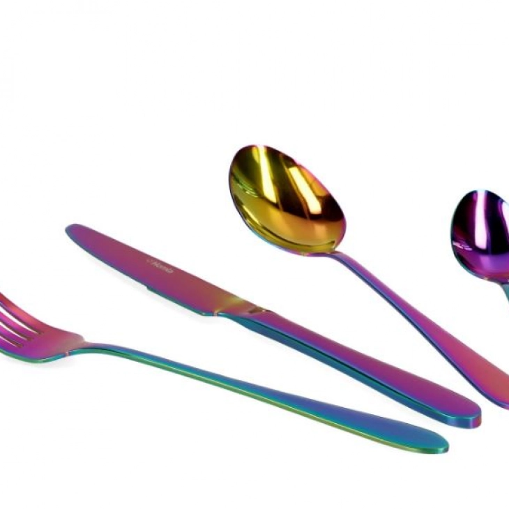 Σετ 16τμχ μαχαιροπήρουνα από ανοξείδωτο ατσάλι με πολύχρωμη, ιριδίζουσα επιφάνεια της σειράς Abele από την Homla. Το σετ περιλαμβάνει: 4 κουτάλια φαγητού 20εκ., 4 πηρούνια φαγητού 20εκ., 4 μαχαίρια φαγητού 22εκ. και 4 κουταλάκια γλυκού 14εκ. Συνιστάται πλύσιμο στο χέρι. Το πλύσιμο των μαχαιροπίρουνων στο πλυντήριο πιάτων μπορεί να προκαλέσει ξεθώριασμα ή φθορά του χρώματος.