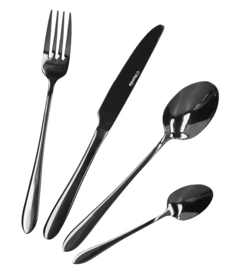 Σετ 16τμχ μαχαιροπήρουνα από ανοξείδωτο ατσάλι με χρωματική επικάλυψη γυαλιστερό μαύρο με εφέ καθρέπτη της σειράς Abele από την Homla. Το σετ περιλαμβάνει: 4 κουτάλια φαγητού 20εκ., 4 πηρούνια φαγητού 20εκ., 4 μαχαίρια φαγητού 22εκ. και 4 κουταλάκια γλυκού 14εκ. Συνιστάται πλύσιμο στο χέρι. Το πλύσιμο των μαχαιροπίρουνων στο πλυντήριο πιάτων μπορεί να προκαλέσει ξεθώριασμα ή φθορά του χρώματος.