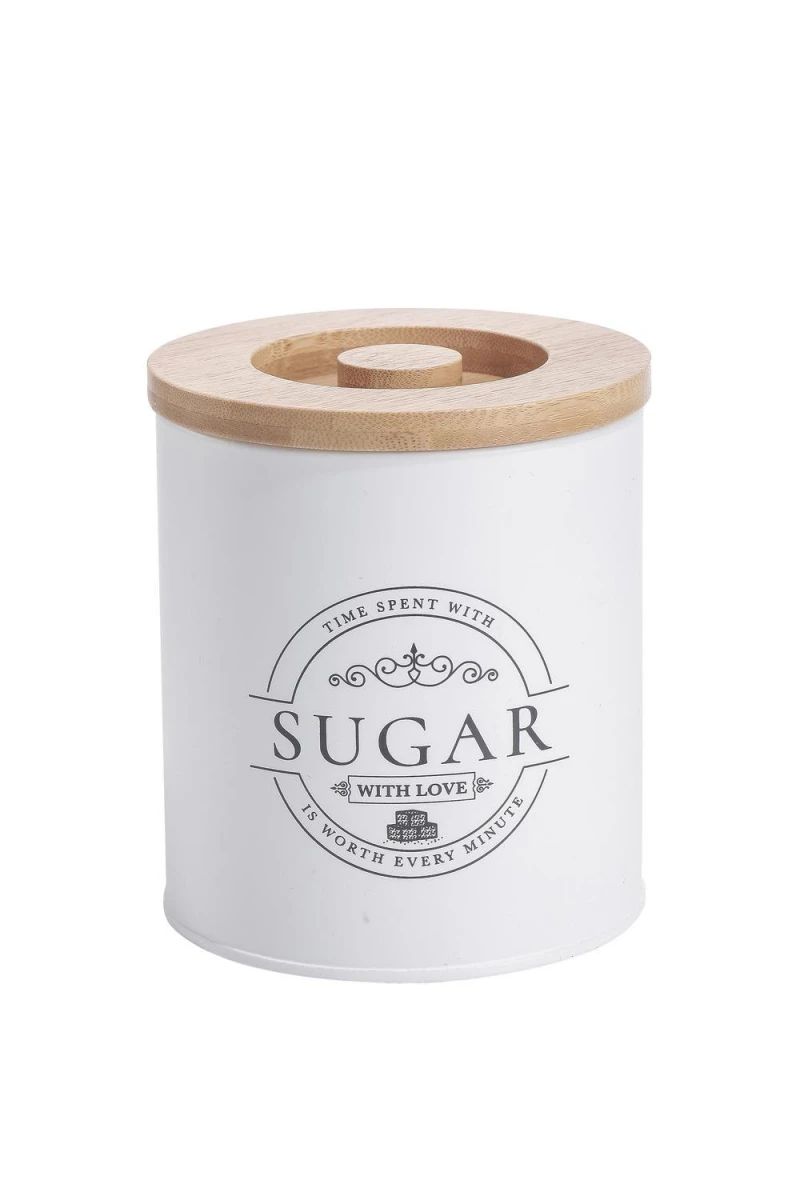 Βάζο ζάχαρης μεταλλικό σε λευκό χρώμα με καπάκι από ξύλο bamboo, της σειράς Kitchen Trend από την Oriana Ferrelli - Διαστάσεις: 11x11x15εκ.