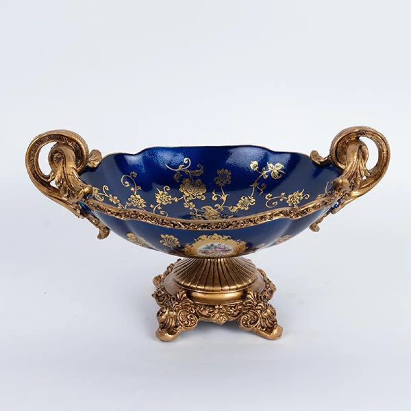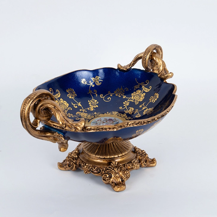 Διακοσμητικό Μπωλ Με Πόδι Πορσελάνης-Polyresin Μπλε-Χρυσό Με Λουλούδια 33x22x19εκ. ESTHETI 752-21021