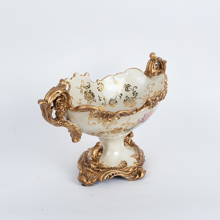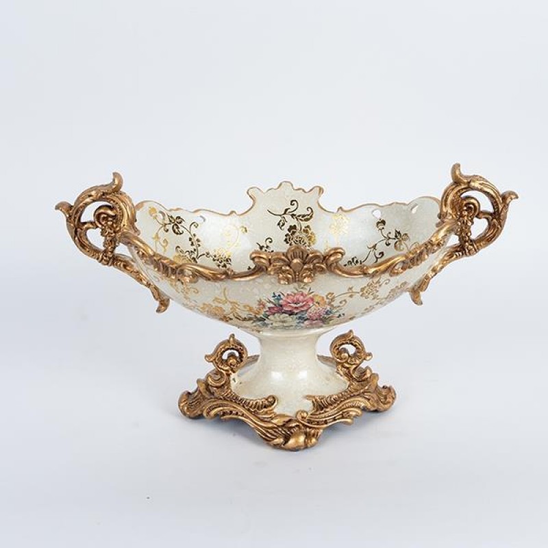 Διακοσμητικό Μπωλ Με Πόδι Πορσελάνης-Polyresin Λευκό-Χρυσό Με Λουλούδια 42x23x24εκ. ESTHETI 752-21059