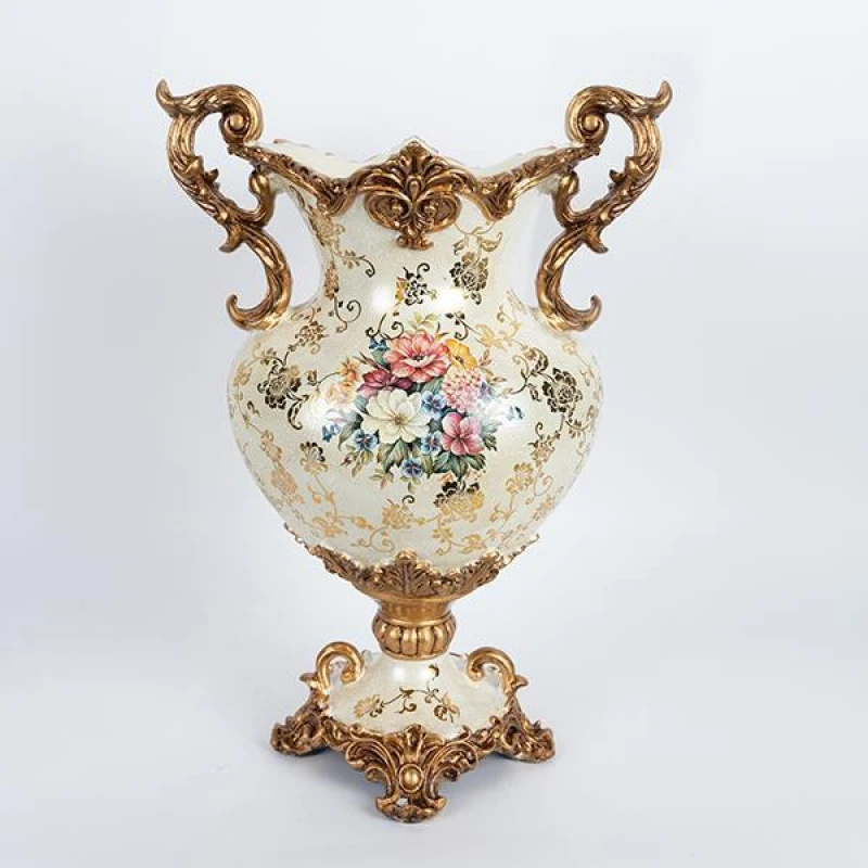 Βάζο πορσελάνης - polyresin με σχέδιο λουλούδια σε λευκό - χρυσό χρώμα από την ESTHETI - Διαστάσεις: 34x22x48εκ.