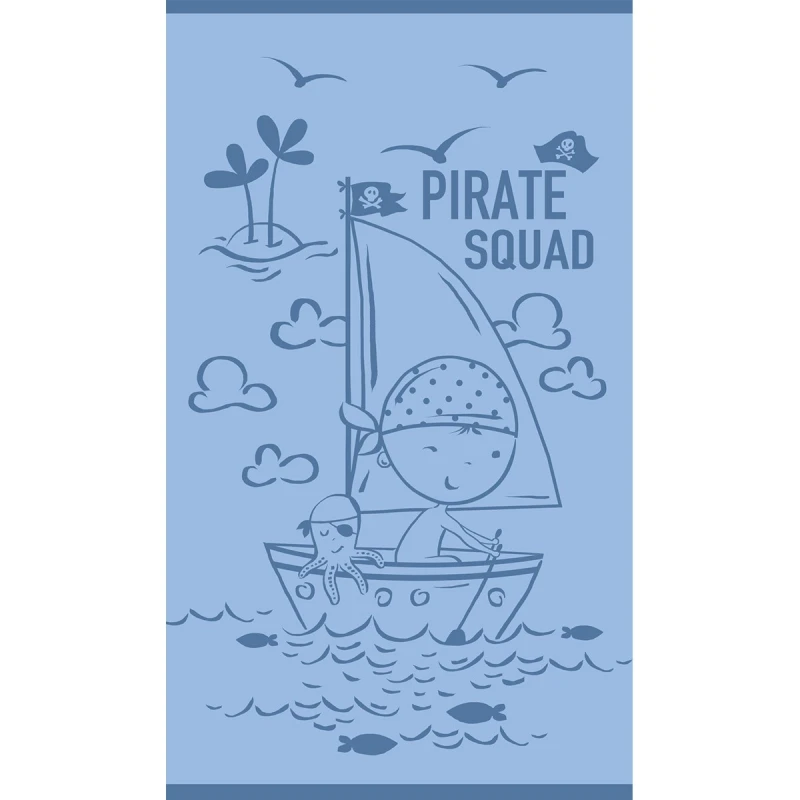 Παιδική πετσέτα θαλάσσης Pirate Squad Blue από τη Melinen, για μοναδικό στυλ στην παραλία! Είναι κατασκευασμένη από 100% βαμβακερό - jacquard velour ύφασμα, ιδιαίτερα απορροφητική και απαλή, ανθεκτική στις χρήσεις και τα συχνά πλυσίματα.