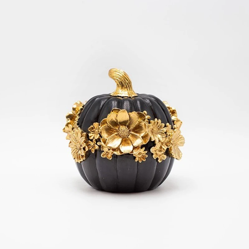 Διακοσμητική κολοκύθα polyresin με σχέδιο λουλούδια σε χρυσό - μαύρο χρώμα από την ESTHETI - Διαστάσεις: 14,8x14,4x14,2εκ.