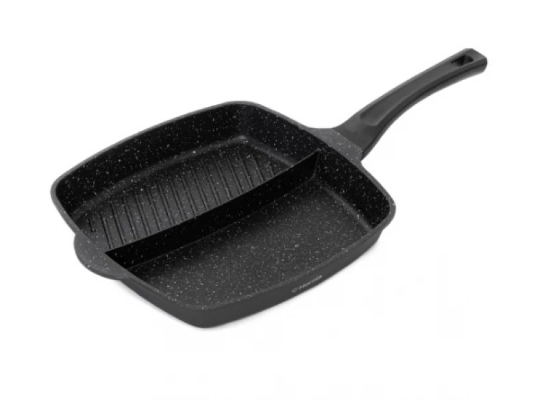 Τηγάνι αλουμινίου με αντικολλητική επίστρωση και λαβή soft touch διπλό με χώρισμα (το μισό είναι σχαρωτό-μισό ίσιο) από την Homla - Διαστάσεις: 28εκ.