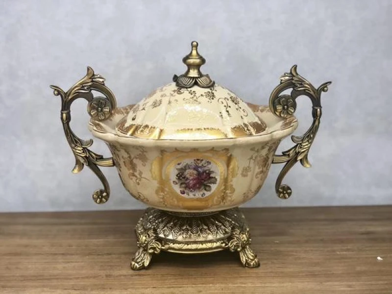 Διακοσμητικό Μπωλ Με Πόδι & Καπάκι Πορσελάνης-Polyresin Μπεζ-Χρυσό Με Λουλούδια 35x21x30εκ. ESTHETI 819-00092