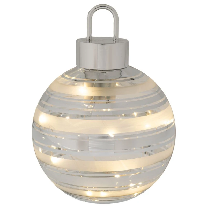 Χριστουγεννιάτικη διακοσμητική γυάλινη μπάλα σε λευκό χρώμα με ασημί ρίγα ζωγραφισμένη στο χέρι και led φως μπαταρίας από την iliadis - Διαστάσεις: Φ15εκ.