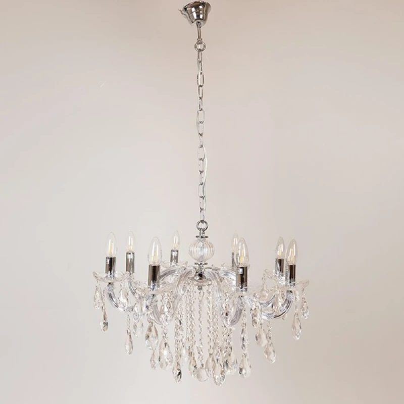 Πρόκειται για έναν εντυπωσιακό πολυέλαιο με κλασική αισθητική και κομψό σχεδιασμό. Με τους καμπύλους βραχίονές του και τις διακοσμητικές γυάλινες λεπτομέρειες που αιχμαλωτίζουν το φως, αποπνέει πολυτέλεια και φινέτσα. Οι λαμπτήρες τύπου κηροπήγιου αναδεικνύουν τη διαχρονική του γοητεία, ενώ οι κρυστάλλινες κρεμαστές σταγόνες χαρίζουν λάμψη και ατμοσφαιρικότητα σε κάθε χώρο. Είναι ιδανικός για να τραβά τα βλέμματα και να προσθέτει αριστοκρατικό χαρακτήρα στο περιβάλλον όπου τοποθετείται.