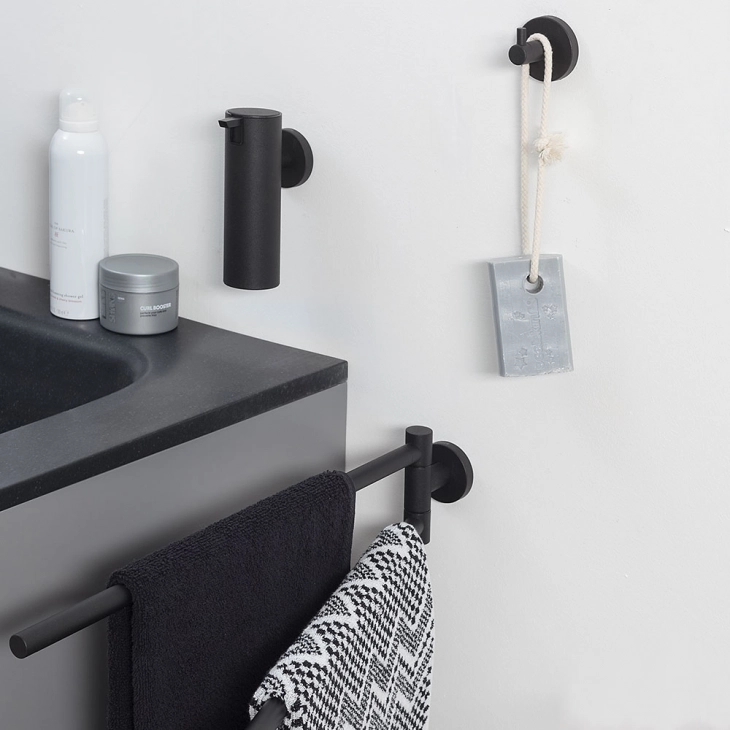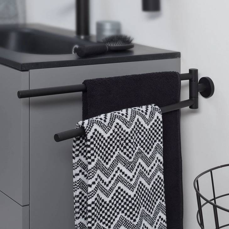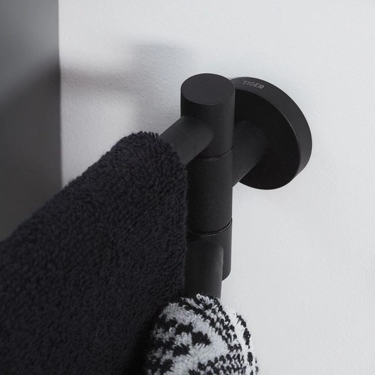 Η κρεμάστρα πετσετών Tiger Boston διαθέτει σύγχρονο μαύρο ματ φινίρισμα και έχει δύο βραχίονες, καθένας από τους οποίους μπορεί να υποδεχτεί μία πετσέτα κανονικού μεγέθους. Οι περιστρεφόμενοι βραχίονες επιτρέπουν τη βέλτιστη χρήση του χώρου γύρω από το νιπτήρα. Η ράγα πετσετών δύο βραχιόνων μπορεί εύκολα να τοποθετηθεί στον τοίχο και το υλικό στερέωσης (περιλαμβάνεται) κρύβεται μετά την τοποθέτηση για κομψή εμφάνιση. Η σειρά Boston περιλαμβάνει μια μεγάλη ποικιλία από άλλα αξεσουάρ για το μπάνιο και την τουαλέτα, όλα όμορφα συνδυασμένα.