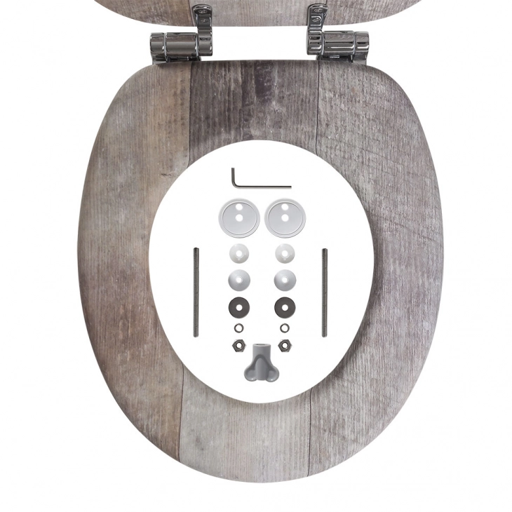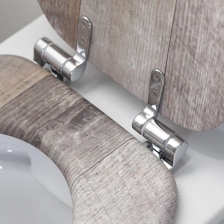Τα καθίσματα τουαλέτας Old Wood είναι η ιδανική λύση για όσους θέλουν να καθίσουν όμορφα και απαλά. Το κάθισμα είναι εξαιρετικά άνετο λόγω του φινιρίσματος με ειδική επίστρωση από καουτσούκ. Απορροφά γρήγορα τη θερμοκρασία του σώματος και δεν το αισθάνεστε ποτέ κρύο. Με το μοτίβο του φυσικού ξύλου, δίνει στο μπάνιο μια ζεστή αίσθηση. Το καπάκι και το κάθισμα κλείνουν αργά από τους μεντεσέδες λόγω του μηχανισμού soft-close. Με αυτόν τον τρόπο το κεραμικό της λεκάνης τουαλέτας δεν καταστρέφεται και είναι επίσης αθόρυβο. Η επιφάνεια παραμένει υγιεινή λόγω της ειδικής επίστρωσης που εξασφαλίζει επίσης ότι ο σχεδιασμός είναι ανθεκτικός στην υπεριώδη ακτινοβολία και παραμένει όμορφος για χρόνια. Πριν αντικαταστήσετε το κάθισμα τουαλέτας σας, συνιστάται να ρίξετε μια ματιά στο γραμμικό σχέδιο αυτού του άρθρου. Περιέχει όλες τις απαραίτητες μετρήσεις και αν ταιριάζουν με τη λεκάνη της τουαλέτας σας, είστε σίγουροι ότι συνδέεται σταθερά.