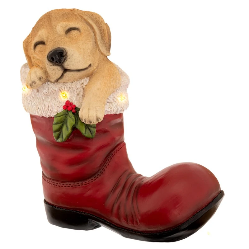 Χριστουγεννιάτικη διακοσμητική καφέ μποτα με σκυλάκι και led φως από την iliadis - Διαστάσεις: 22x13x24εκ.