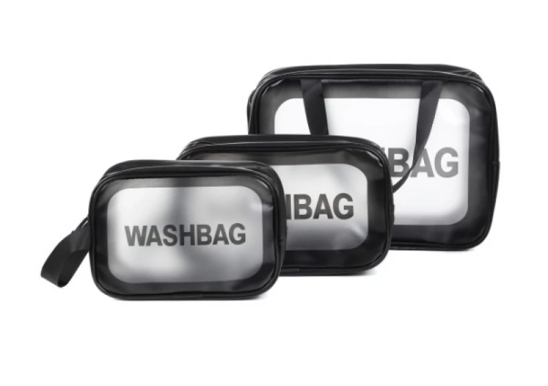 Πρακτικό σετ από 3 τσαντάκια καλλυντικών με διαφάνεια και την ένδειξη WASHBAG. Ιδανικά για ταξίδια, καλλυντικά ή μικροαντικείμενα, προσφέρουν οργάνωση με στυλ.