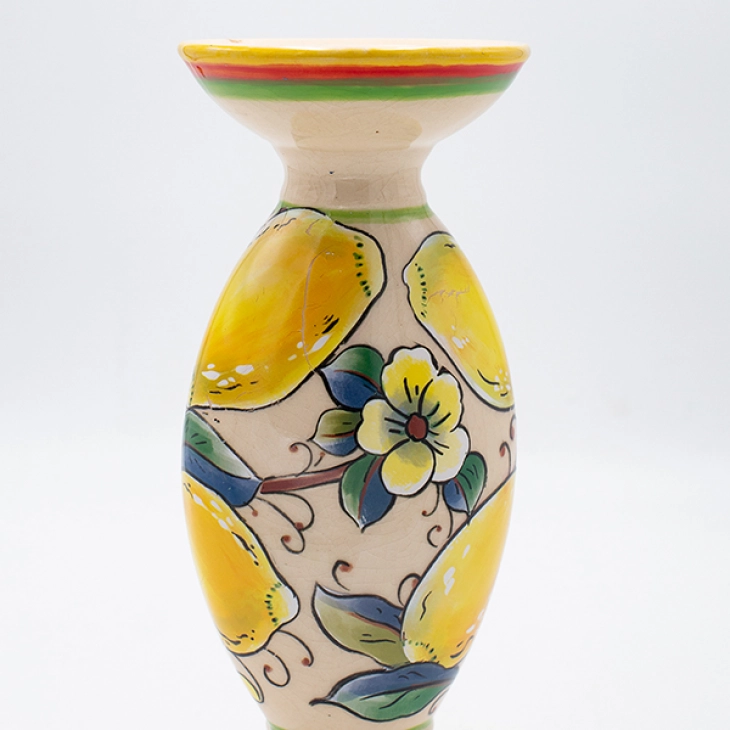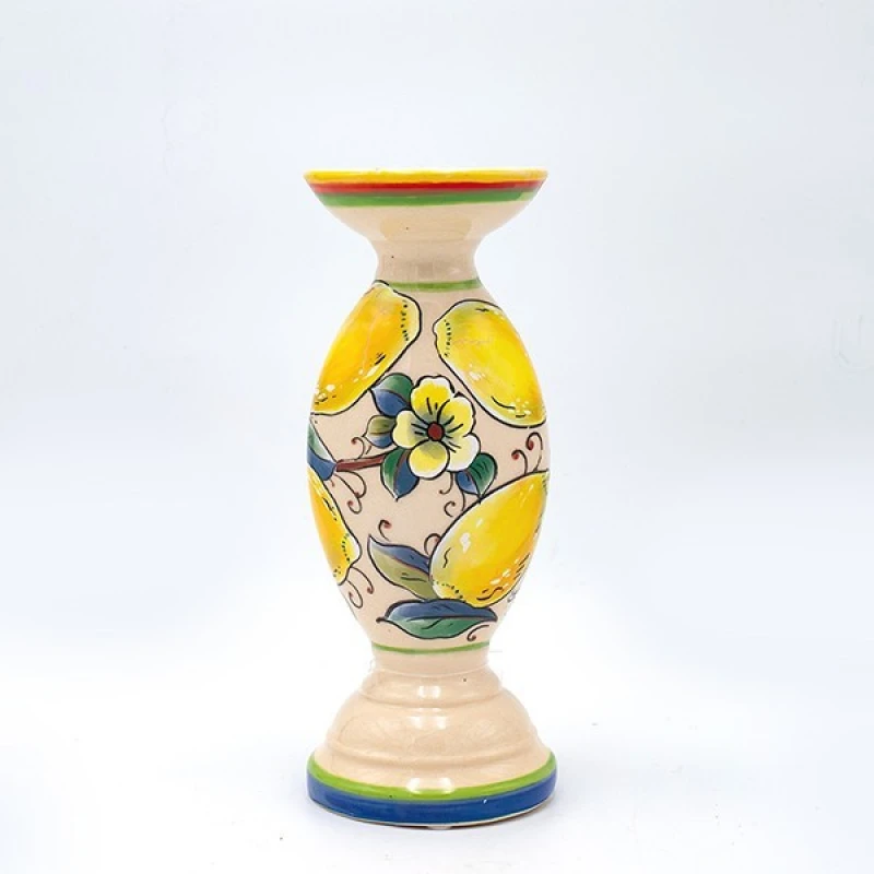 Κηροπήγιο κεραμικό σε μπεζ χρώμα με πολύχρωμα σχέδια και κίτρινα λεμόνια από την ESTHETI - Διαστάσεις: 10x25εκ.