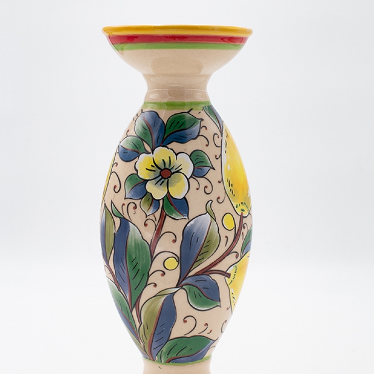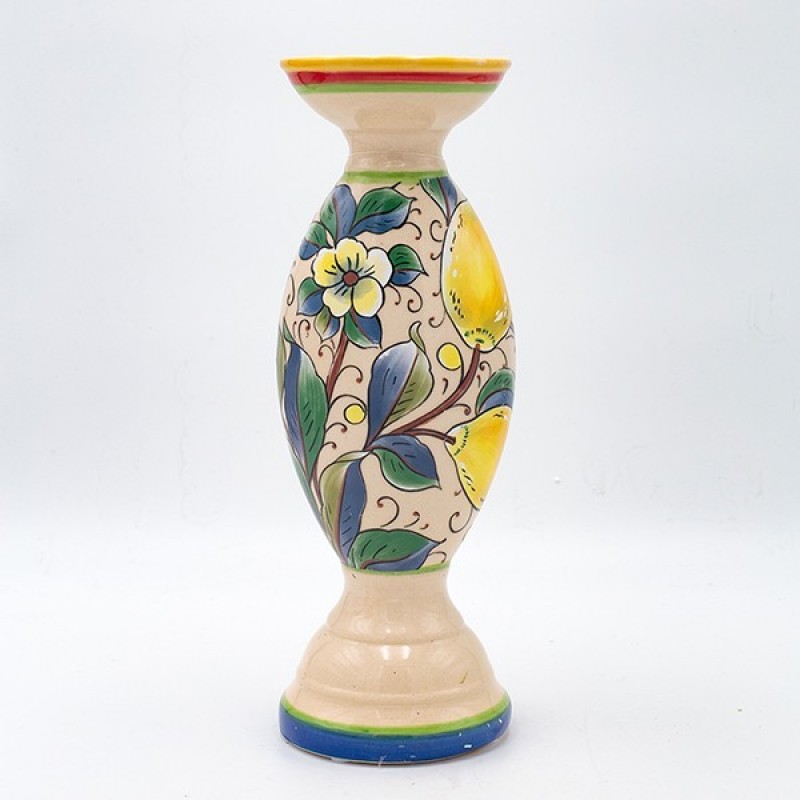 Κηροπήγιο κεραμικό σε μπεζ χρώμα με πολύχρωμα σχέδια και κίτρινα λεμόνια από την ESTHETI - Διαστάσεις: 10,2x30εκ.