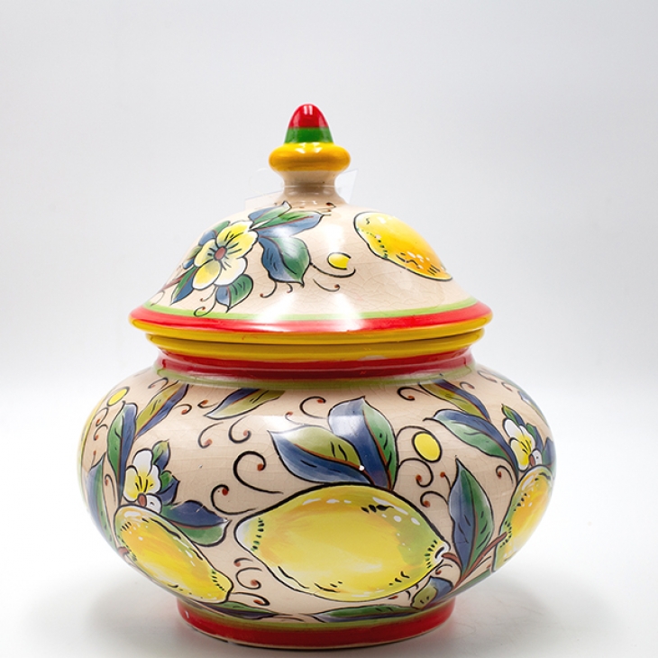 Διακοσμητικό μπωλ με καπάκι κεραμικό σε μπεζ χρώμα με πολύχρωμα σχέδια και κίτρινα λεμόνια από την ESTHETI - Διαστάσεις: 20,5x22εκ.