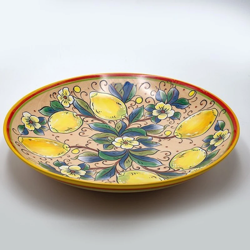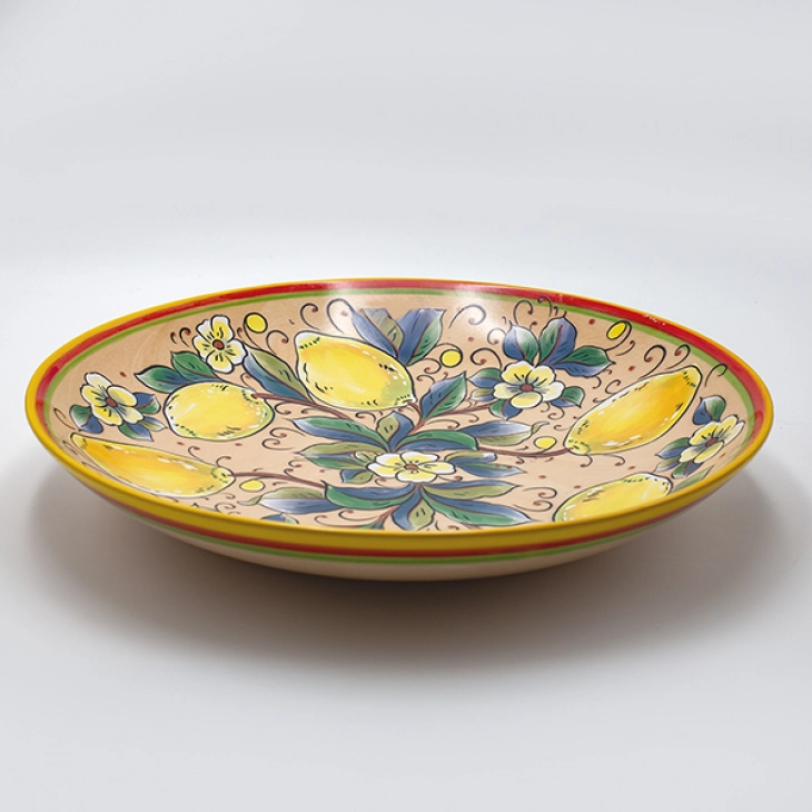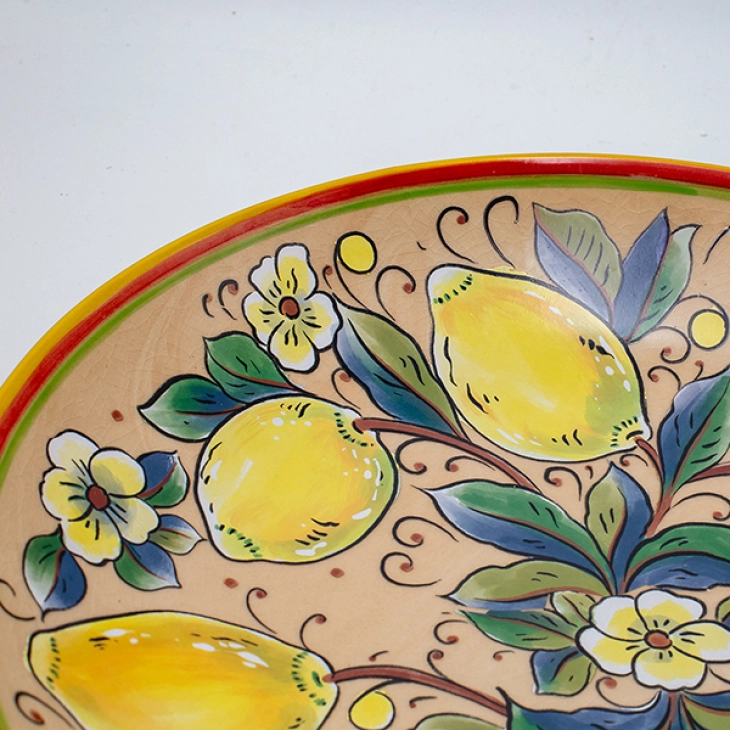 Διακοσμητική πιατέλα κεραμική σε μπεζ χρώμα με πολύχρωμα σχέδια και κίτρινα λεμόνια από την ESTHETI - Διαστάσεις: 36,3x6εκ.