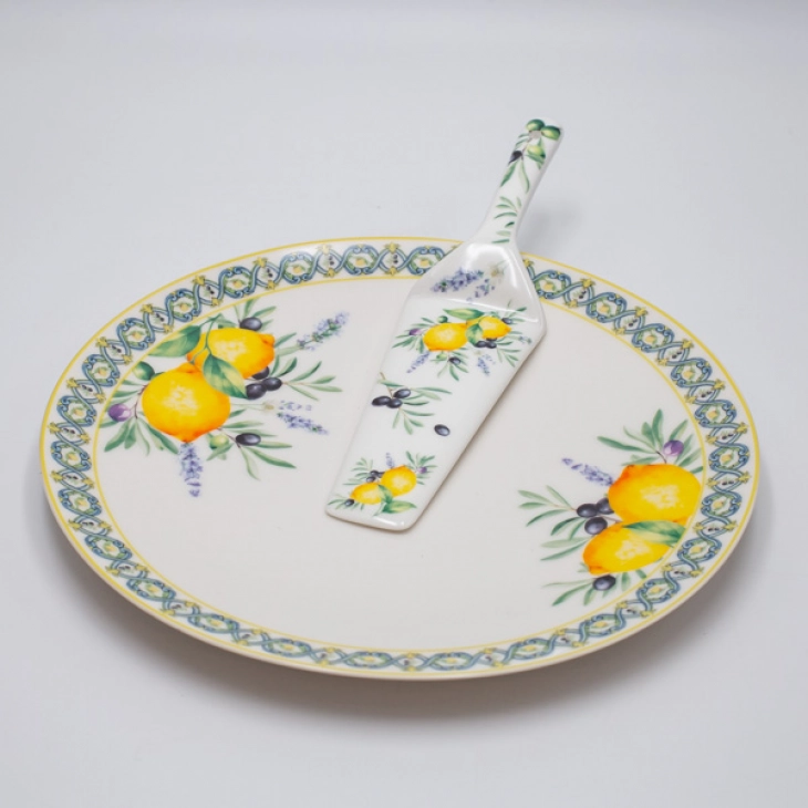 Σετ 2τμχ πιατέλα με σπάτουλα σερβιρίσματος πορσελάνης σε λευκό χρώμα με πολύχρωμα σχέδια και κίτρινα λεμόνια από την ESTHETI - Διαστάσεις πιατέλας: 26εκ.
