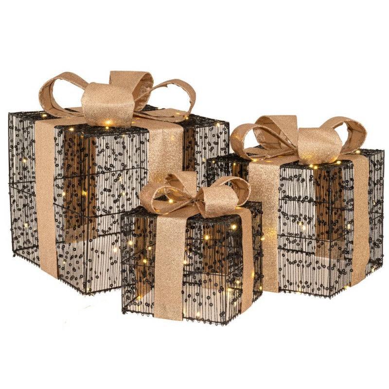 Χριστουγεννιάτικο σετ 3τμχ δώρα σε μαύρο χρώμα με χρυσό φιόγκο και led από την iliadis - Διαστάσεις: 15x15x17ΕΚ+20LED, 20x20x23εκ.+30LED, 25x25x30εκ.+40LED.