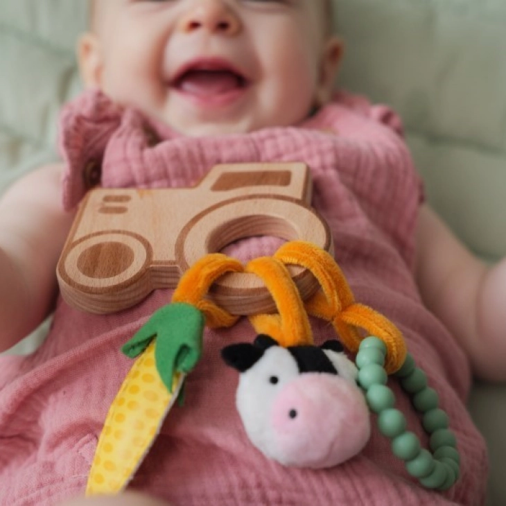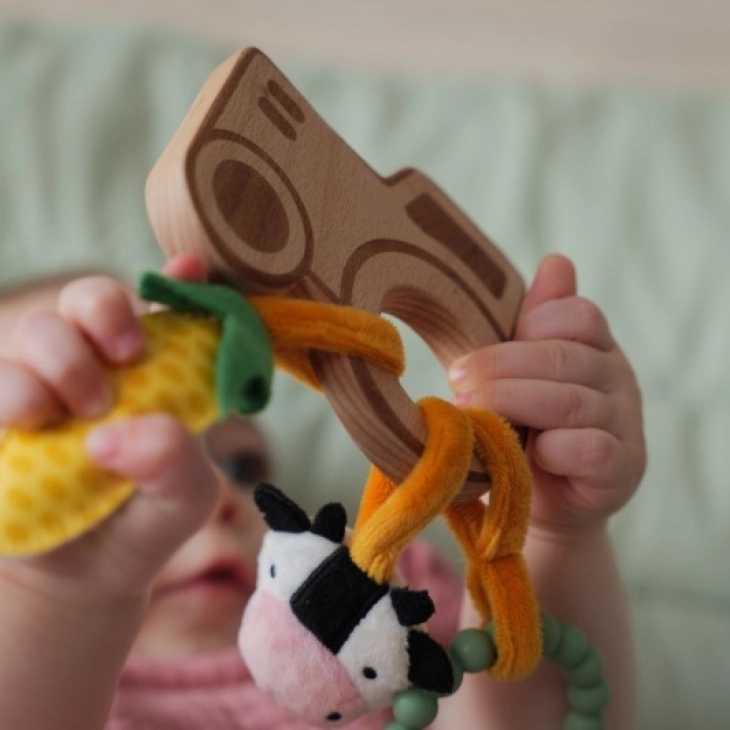 Τα τρία βαμβακερά κορδόνια έχουν στις άκρες τους κρεμαστά στοιχεία για να διεγείρουν τις αισθήσεις και να τραβήξουν την προσοχή του μωρού: ένα υφασμάτινο φύλλο, ένα μαλακό δαχτυλίδι και ένα απαλό βελούδινο παιχνίδι, τον Ζακ το Τουκάν.