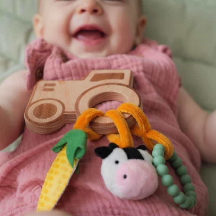 Τα τρία βαμβακερά κορδόνια έχουν στις άκρες τους κρεμαστά στοιχεία για να διεγείρουν τις αισθήσεις και να τραβήξουν την προσοχή του μωρού: ένα υφασμάτινο φύλλο, ένα μαλακό δαχτυλίδι και ένα απαλό βελούδινο παιχνίδι, τον Ζακ το Τουκάν.
