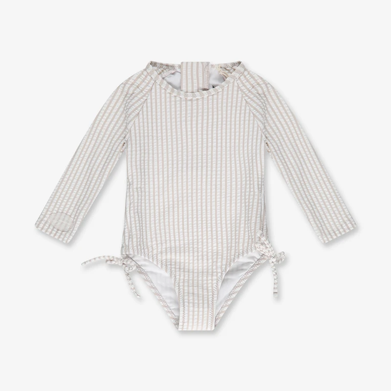 Με το Ολόσωμο Μαγιώ UV Pink&White με κορδονάκια και μανίκια από τη Minene, το στυλ του μικρού σας θα είναι μοναδικό και στην παραλία!