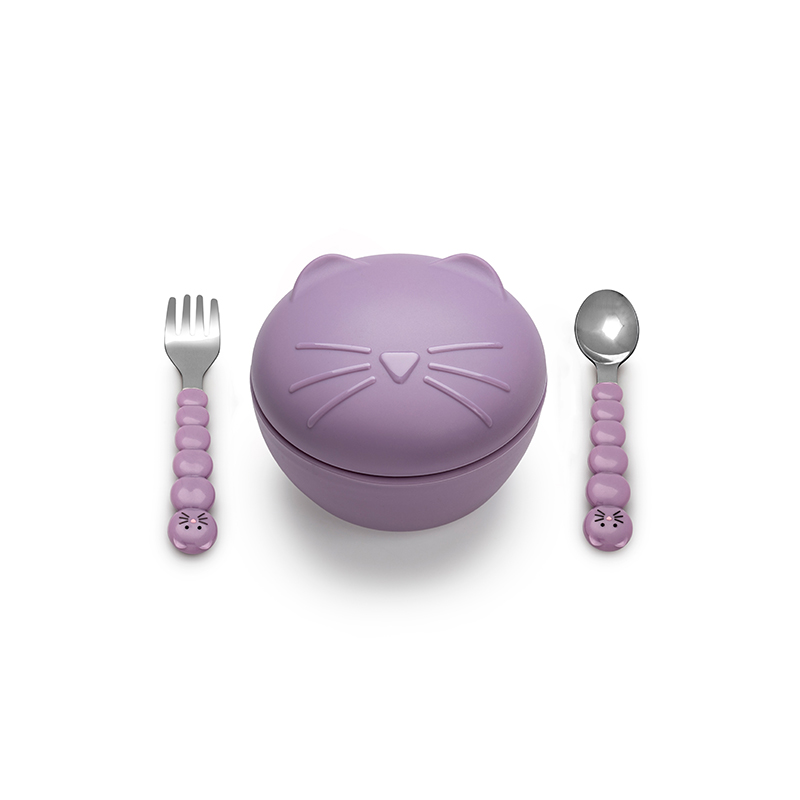 Melii – Σετ φαγητού σιλικόνης Cat. Ένα φανταστικό μπολ σιλικόνης με καπάκι από την Melii που μπορεί να μεταφέρει το παιδί μικρά γεύματα ή σνακ με στυλ και σετ τα δικά του κουταλοπήρουνα! Είναι παιχνιδιάρικο και στεγανό φαγητοδοχείο, φτιαγμένο σε μέγεθος ειδικά για τα μικρά χεράκια! Είναι ανθεκτικό και ελαφρύ, κατασκευασμένο απο υψηλής ποιότητας σιλικόνη τροφίμων. Ιδανικό μπολ για τα σνακ ή το κυρίως γεύμα του παιδιού σας! Το κουτάλι και το πηρούνι είναι ιδανικά για τα μικρά χεράκια των παιδιών που ξεκινούν τώρα την ανεξάρτητη σίτιση. Επίσης το πηρουνάκι έχει στρογγυλεμένες άκρες για μεγαλύτερη ασφάλεια! Καθαρίζεται πολύ εύκολα και μπαίνει με ασφάλεια στην επάνω σχάρα του πλυντηρίου πιάτων!
