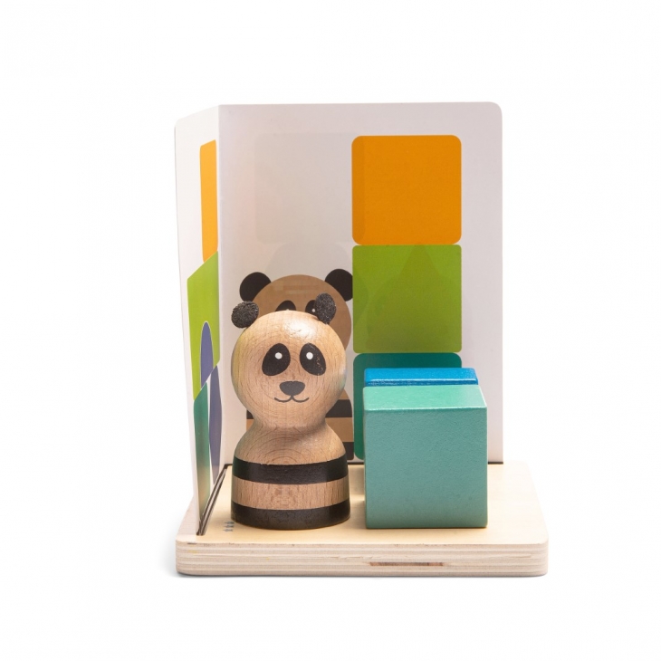 Περιλαμβάνει μία βάση 13,5×13,5εκ., μικρό ξύλινο πάντα 4,5×4,5×8,5εκ., 7 κομμάτια παζλ, 10 κάρτες διπλής όψεως.