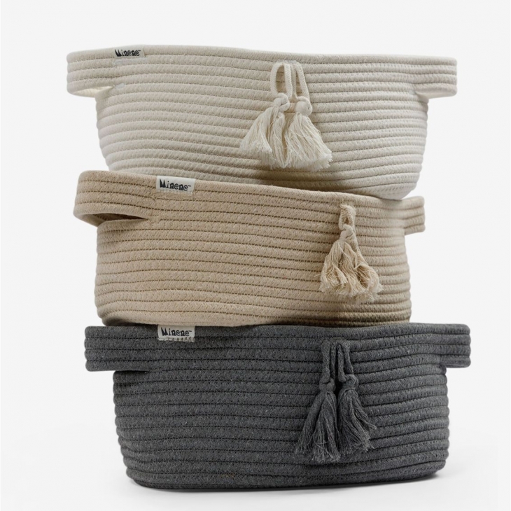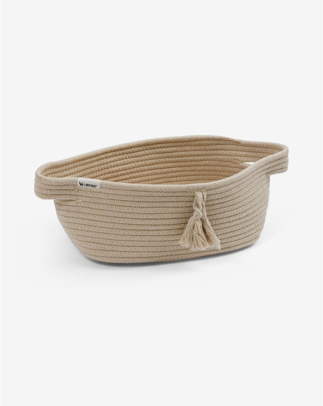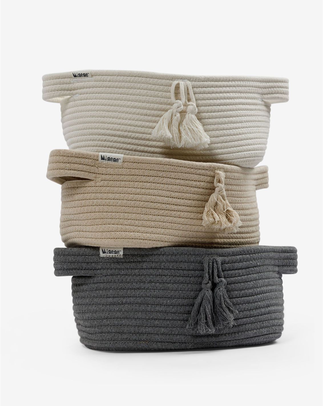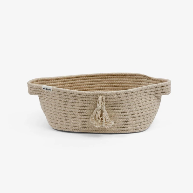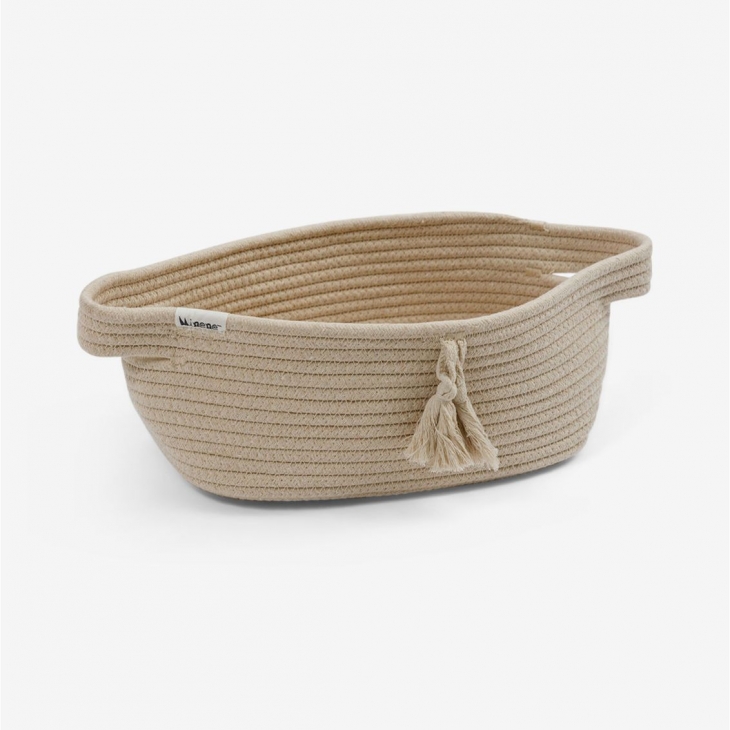 Minene Μικρό Καλάθι Μπεζ κατασκευασμένο από βαμβακερό σχοινί. Φυσικό καλάθι αποθήκευσης με χερούλια διακοσμημένο με φούντες, από 100% ποιοτικό βαμβάκι.