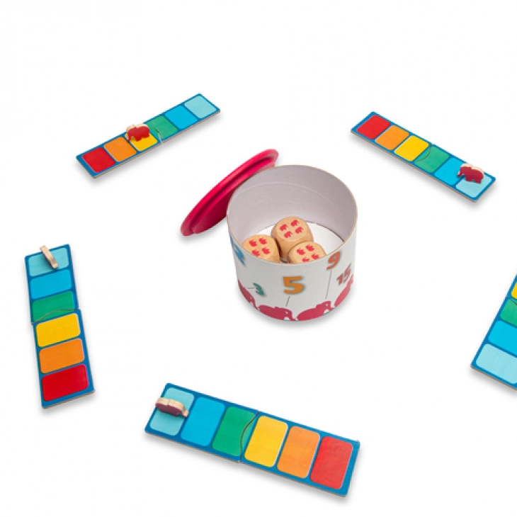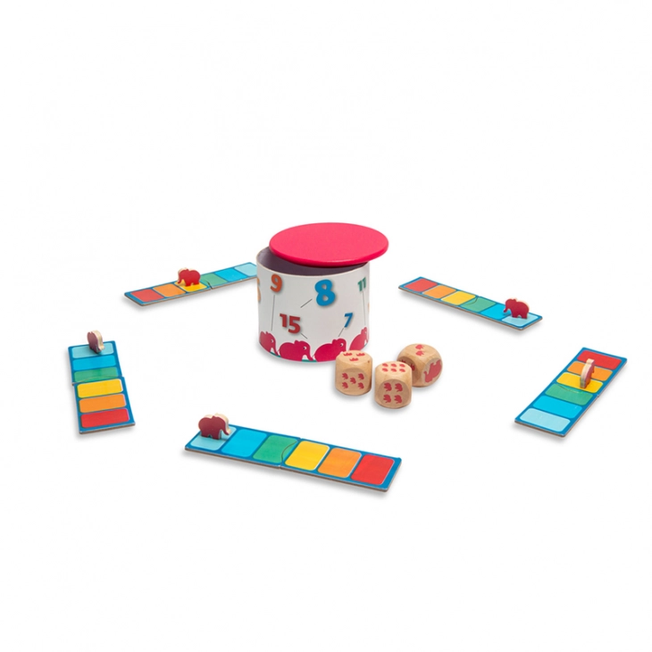 Bs Toys – Elephants Bluff – FSC 100%. Ρίξε και τα 3 ζάρια μέσα στο ποτήρι και μέτρα τους ελέφαντες. Κλείσε το καπάκι και πέρασέ το στον επόμενο λέγοντάς του πόσοι ροζ ελέφαντες είναι μέσα.