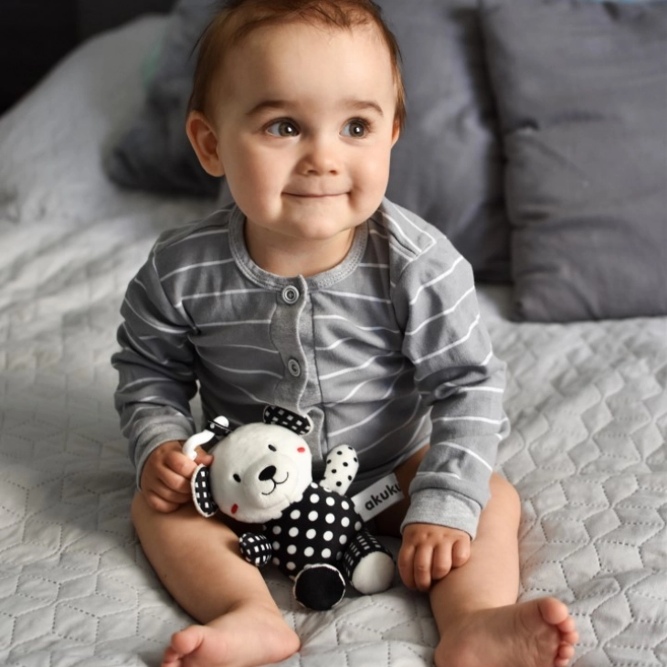 Ασπρόμαυρη κουδουνίστρα σε σχέδιο αρκουδάκι. Μια διασκεδαστική κουδουνίστρα φτιαγμένη από μαλακά υλικά για να αναπτύσσει την αίσθηση της αφής.
