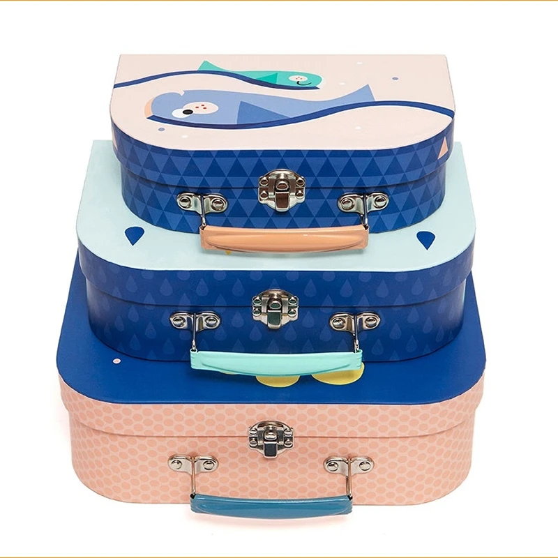 Η μικρότερη βαλίτσα έχει πάνω της ζωγραφισμένα ψαράκια, η μεσαία σταγόνες και η μεγαλύτερη ένα λαμπερό φεγγάρι!