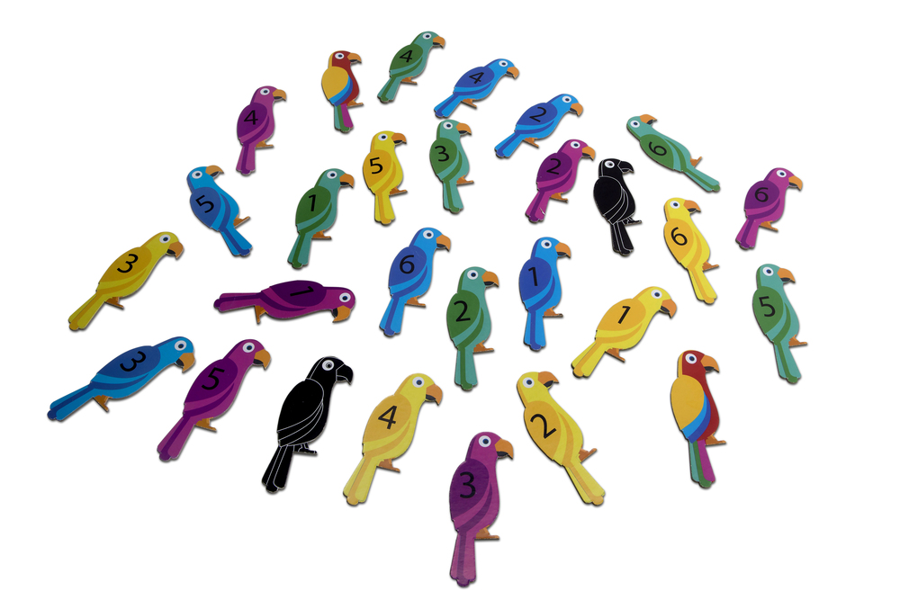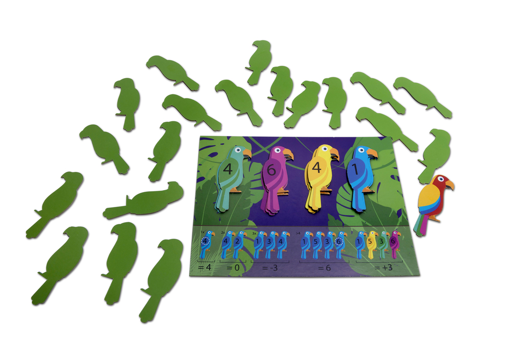 Αυτό το εξωτικό παιχνίδι περιλαμβάνει 28 πανέμορφους χρωματιστούς παπαγάλους και 4 μεγάλες κάρτες υπολογισμού και τοποθέτησης.