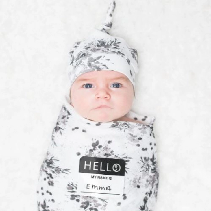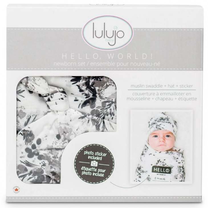 Η σειρά Hello World της Lulujo ταιριάζει μια υπέροχη μουσελίνα Black Floral με ένα ίδιο σκουφάκι για την πρώτη φωτογραφία του μωρού!