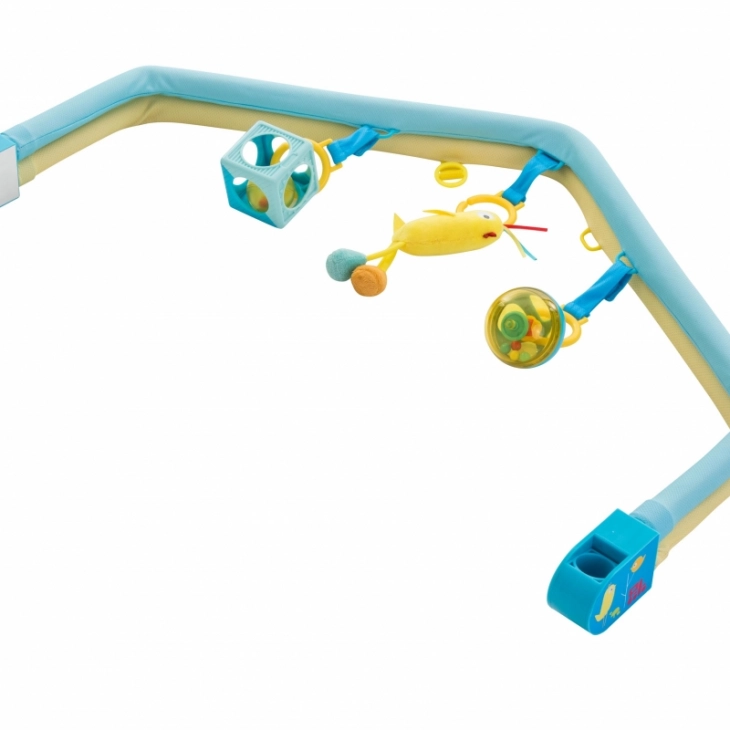Έχει 3 παιχνίδια που μπορούν να αφαιρεθούν ή να αλλάξουν θέση. Μια χρωματιστή μπαλίτσα, έναν κύβο και ένα μουσικό πουλάκι.
