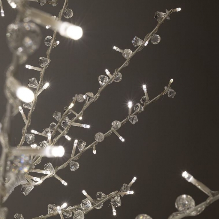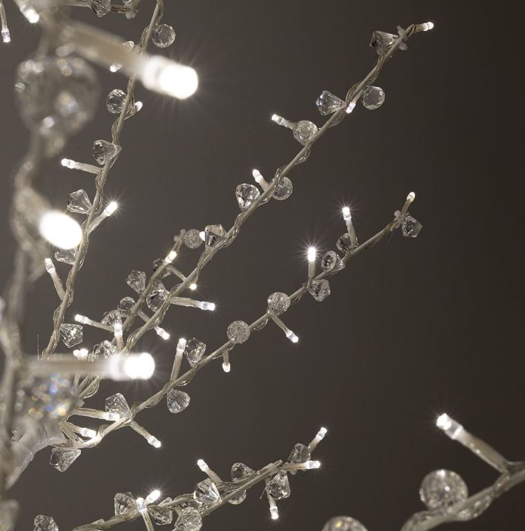 Δένδρο λευκό 380εκ. με κρυσταλλάκια και 2080 led λαμπάκια λευκού θερμού φωτισμού σε λευκή μεταλλική βάση. Λειτουργεί με ρεύμα.