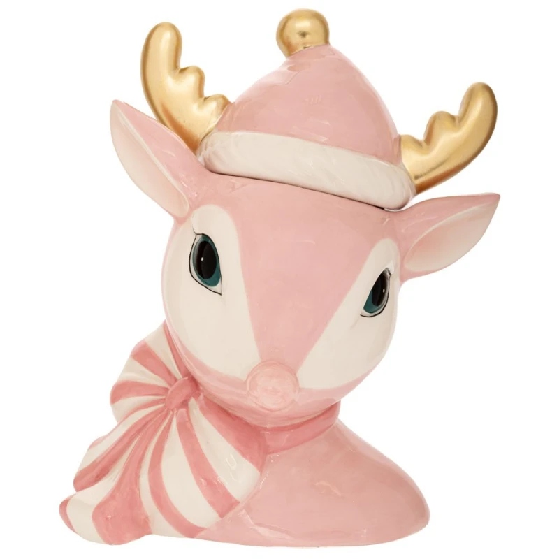 Χριστουγεννιάτικη μπισκοτιέρα κεραμική σε σχήμα κεφάλι ελαφιού σε ροζ - λευκό χρώμα από την iliadis - Διαστάσεις: 20x14,5x23,5εκ.
