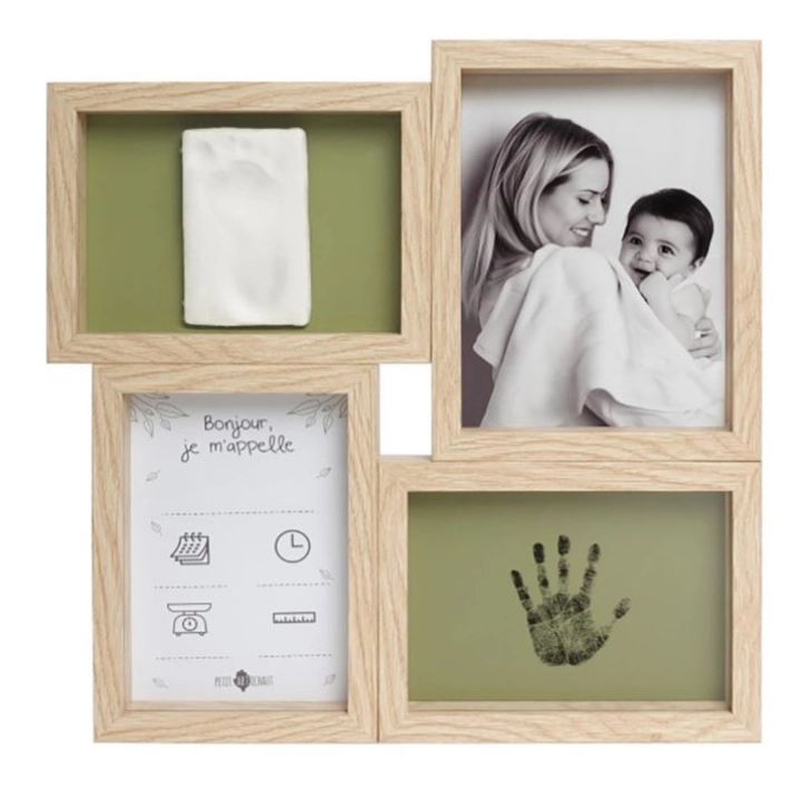 Το Puzzle Frame – Olive Tree είναι μια σύνθεση κορνιζών για την εμφάνιση της φωτογραφίας του μωρού και των αποτυπωμάτων του με πηλό και μελάνι. Συνοδεύεται επίσης με μια αφίσα γέννησης για να γράψετε όλες τις πληροφορίες του γεγονότος: όνομα, βάρος, ύψος, καθώς και την ώρα και την ημέρα άφιξης του μωρού! Το φόντο του πλαισίου είναι δύο όψεων για να διαλέξετε το μοτίβο φυλλώματος ή μονόχρωμο πράσινο χρώμα.