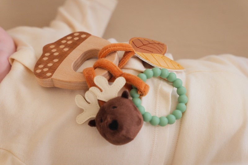 Τα τρία βαμβακερά κορδόνια έχουν στις άκρες τους κρεμαστά στοιχεία για να διεγείρουν τις αισθήσεις και να τραβήξουν την προσοχή του μωρού: ένα υφασμάτινο φύλλο, ένα μαλακό δαχτυλίδι και ένα απαλό βελούδινο παιχνίδι, τον Ζακ το Τουκάν.