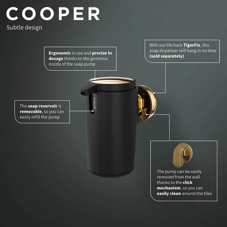 Εξετάζουμε πάντα κριτικά το σχεδιασμό μας και προσπαθούμε να συνεχίσουμε να αναπτύσσουμε και να βελτιώνουμε τα σχέδια των αξεσουάρ μας. Για αυτόν τον διανομέα σαπουνιού Tiger, εμπνευστήκαμε από ένα προηγούμενο σχέδιο και το ανεβάσαμε στο επόμενο επίπεδο. Μπορείτε να δείτε τα οργανικά σχήματα; Αυτή η αντλία είναι εργονομική στη χρήση και εύκολη στη δόση. Ο συνδυασμός του χρυσού με το μαύρο δημιουργεί μια συναρπαστική και σύγχρονη εμφάνιση. Τοποθετείται εύκολα με το TigerFix, Ένα "lifehack"για όσους δεν θέλουν να τρυπήσουν. Με το TigerFix μπορείτε να τοποθετήσετε τα αξεσουάρ μας γρήγορα και εύκολα σε μια λεία, συμπαγή επιφάνεια. Το TigerFix διατίθεται ξεχωριστά.