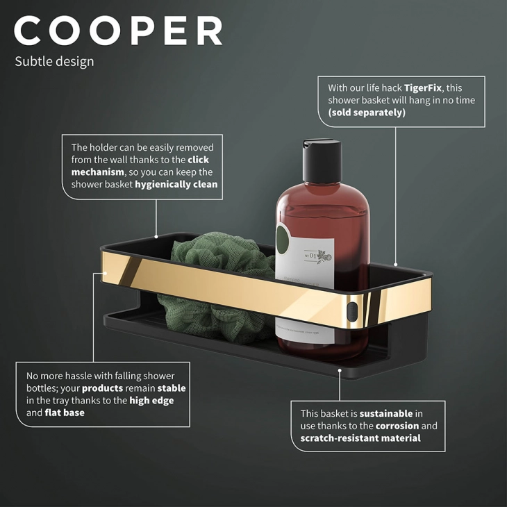 Κυκλικά σχήματα. σχήματα κυλίνδρων, οβάλ και κύκλοι. Ο απαλός σχεδιασμός σας φέρνει σε ισορροπία. Με ένα αρμονικό εσωτερικό φέρνετε περισσότερη θετική ενέργεια στο σπίτι σας. Αυτό το καλάθι ντους από την Tiger Cooper αποπνέει ηρεμία και ισορροπία, αλλά χάρη στον συνδυασμό χρυσού και μαύρου, έχει επίσης μια συναρπαστική και σύγχρονη εμφάνιση. Το Cooper τοποθετείται εύκολα με το TigerFix, Ένα "lifehack"για όσους δεν θέλουν να τρυπήσουν. Με το TigerFix μπορείτε να τοποθετήσετε τα αξεσουάρ μας γρήγορα και εύκολα σε μια λεία, συμπαγή επιφάνεια. Το TigerFix διατίθεται ξεχωριστά.