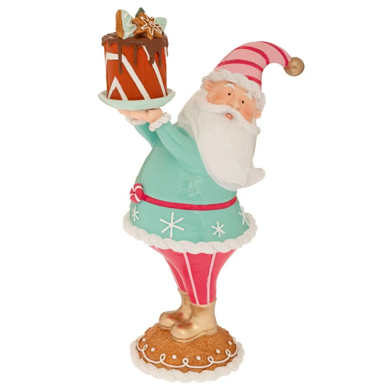 Χριστουγεννιάτικος διακοσμητικός επιτραπέζιος Άγιος Βασίλης που κρατάει τούρτα polyresin σε ροζ - σιέλ χρώμα από την iliadis - Διαστάσεις: 20x13x34εκ.
