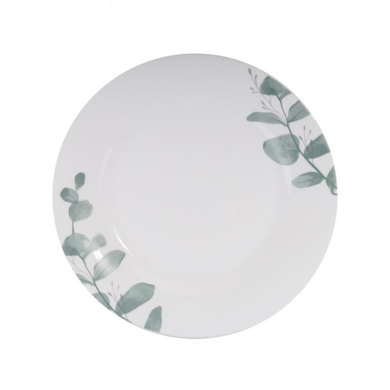 Πιάτο ρηχό φαγητού γυάλινο σε λευκό χρώμα με σχέδιο πράσινα φύλλα της σειράς Leaf από την Eaton Dining - Διαστάσεις: 25,5εκ. - Η ελάχιστη ποσότητα αγοράς για αυτό το προϊόν είναι 6τμχ.