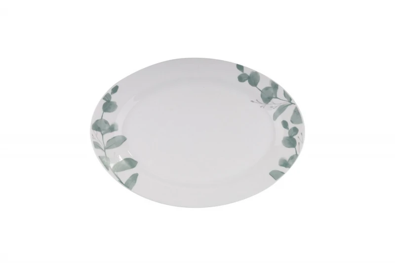 Πιατέλα οβάλ γυάλινη σε λευκό χρώμα με σχέδιο πράσινα φύλλα της σειράς Leaf από την Eaton Dining - Διαστάσεις: 30x22εκ. - Η ελάχιστη ποσότητα αγοράς για αυτό το προϊόν είναι 4τμχ.